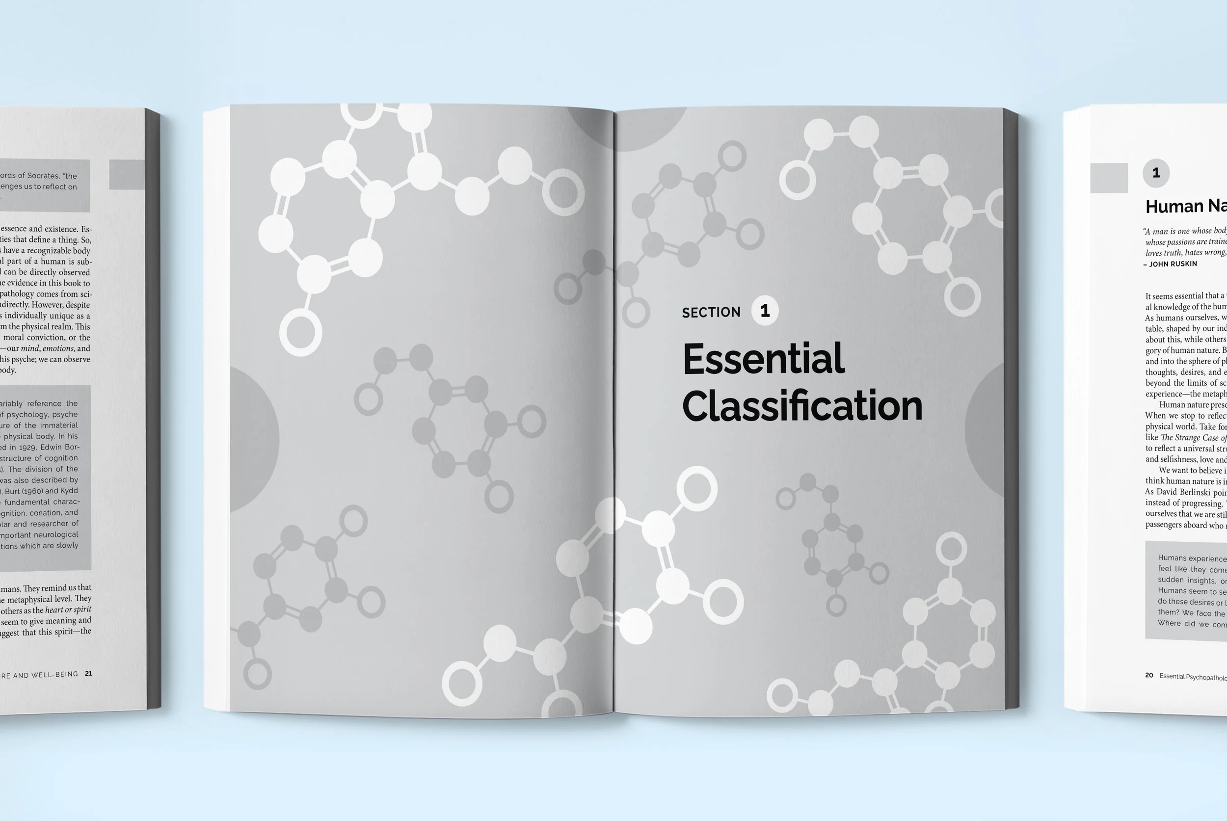 About: I was excited to work on the 5th edition of Essential Psychopathology & Its Treatment, a foundational text in the field of psychiatry. Guided by the authors’ humanistic vision of psychiatry, the design centers on two abstract faces in dialogue, symbolizing empathy, connection, and understanding at the core of mental health treatment. The molecular motif featuring serotonin, dopamine, and norepinephrine carries into the interior, creating a bridge between the biological and the emotional dimensions of care. Despite the book’s dense academic content, the clean typography, modern color palette, and open layouts make it feel fresh, readable, and visually cohesive for a new generation of practitioners.